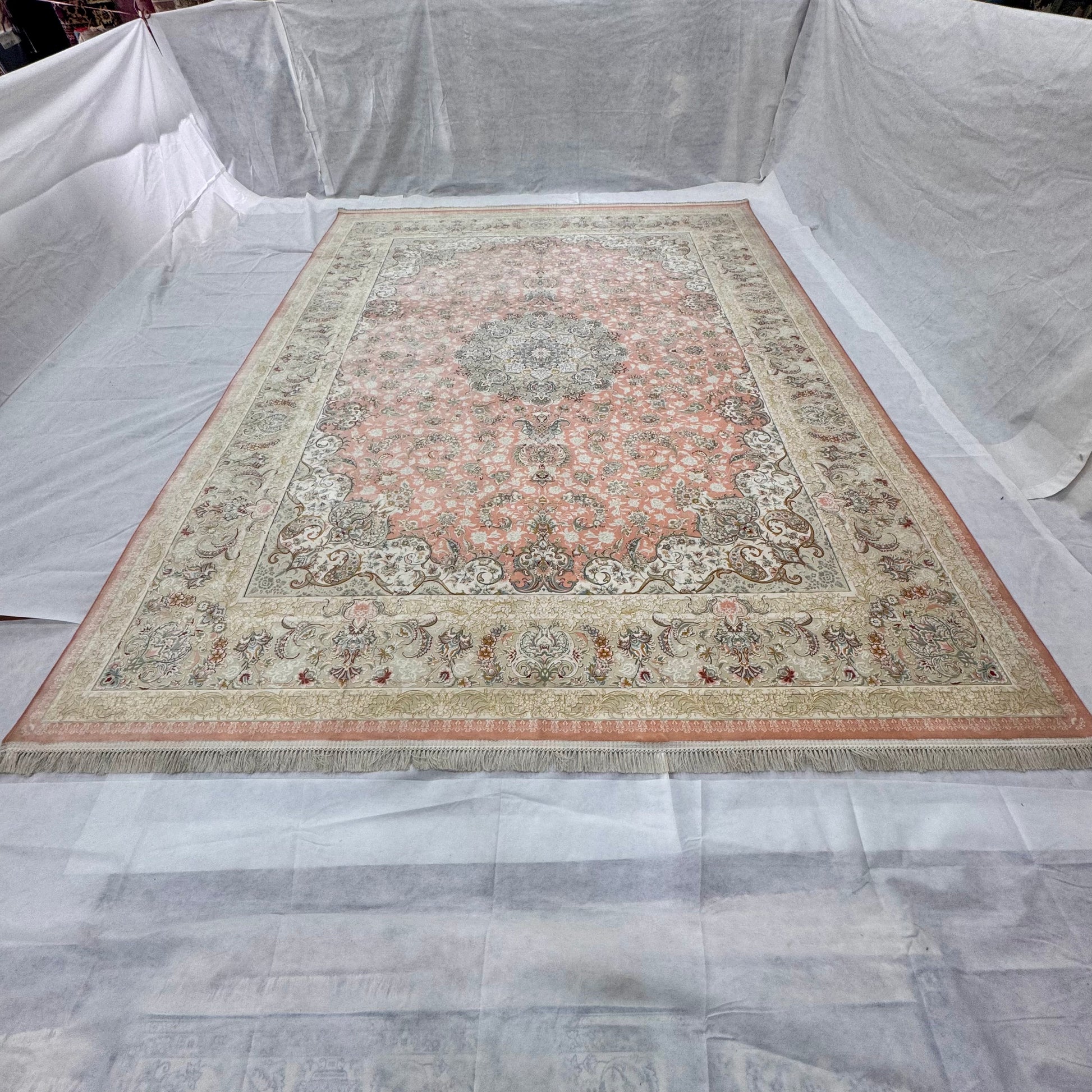 10 ft x 13 ft Persian Silk Rug – Beheshti Tabriz Collection, Coral & Ivory