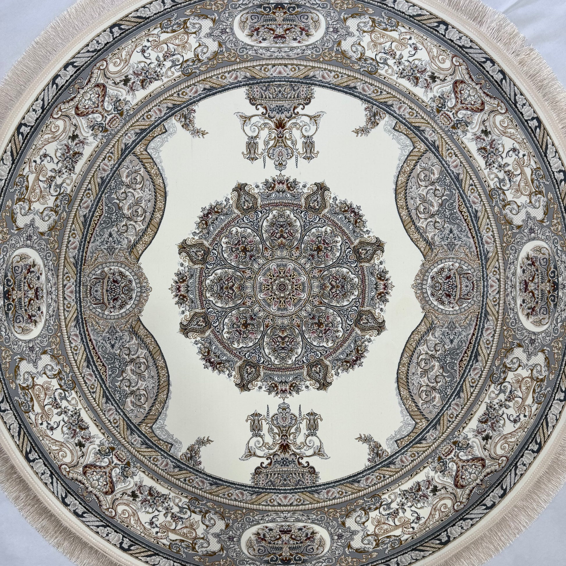This 5ft x 5ft Persian Round Rug by Pars Nagsh Kashan is a refined and sophisticated piece, expertly crafted with 1500 reeds. The rug’s intricate floral design is skillfully woven in a blend of Acrylic and Silk, ensuring both luxurious feel and durability. Its timeless Persian design features soft ivory and beige tones, beautifully contrasted with rich blues and golden accents, making it an exceptional piece for any living space. This rug is made in Iran, showcasing traditional craftsmanship fused with machine-made excellence.
