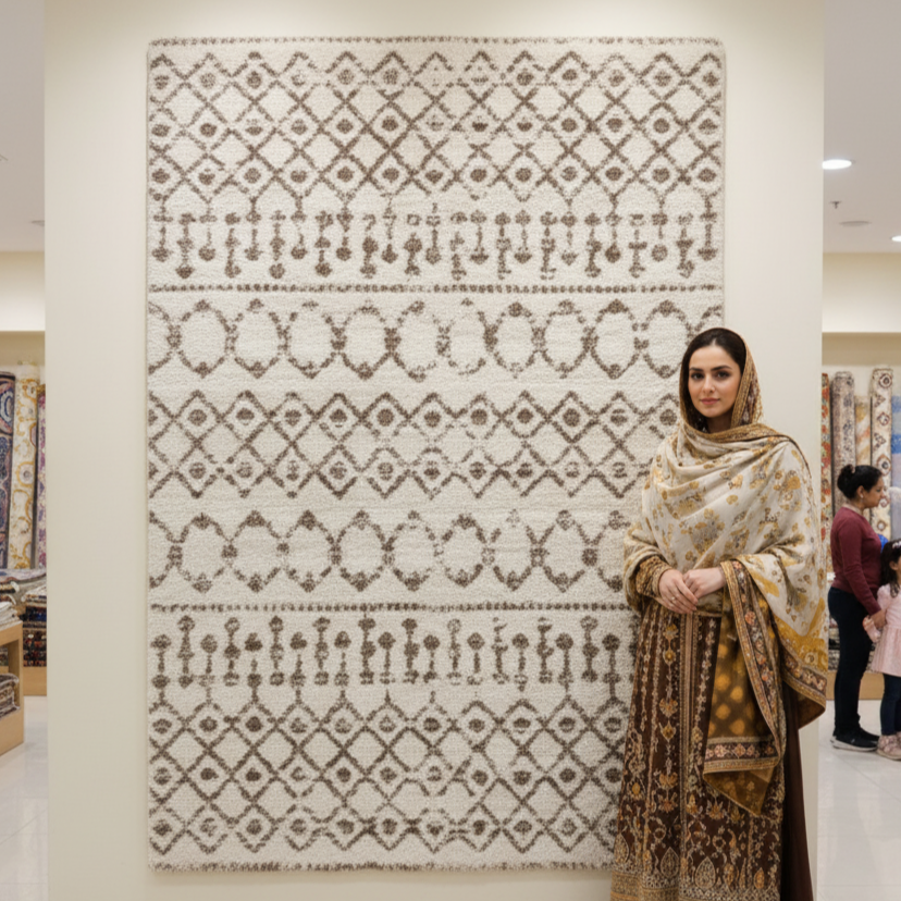 Elevate your space with the 5ft x 8ft Persian Shaggy Rug featuring the Koshani Puffy design. Crafted from synthetic wool, this luxurious rug offers a combination of modern design with a soft, plush texture perfect for any home. The neutral beige and white tones paired with a contemporary geometric pattern make it a versatile addition to a wide range of interiors. Ideal for living rooms, bedrooms, or even office spaces, this rug combines elegance with comfort.