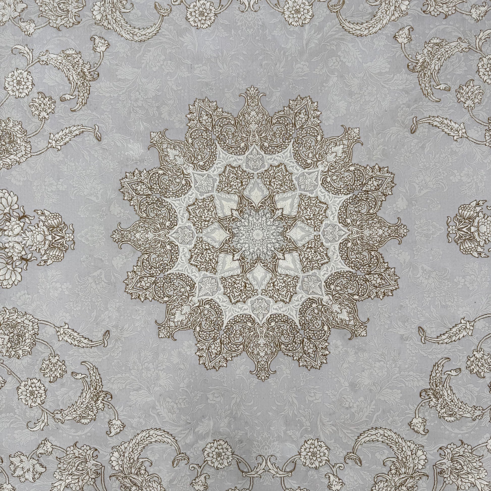 Elevate your home with the Beheshti Tabraiz Persian Rug. This 8x11 ft light grey silk rug, designed with machine-made precision, features elegant Persian floral motifs and a refined medallion centerpiece. Soft, durable, and eco-friendly, it blends luxury with practicality, making it ideal for living rooms, bedrooms, and formal interiors.