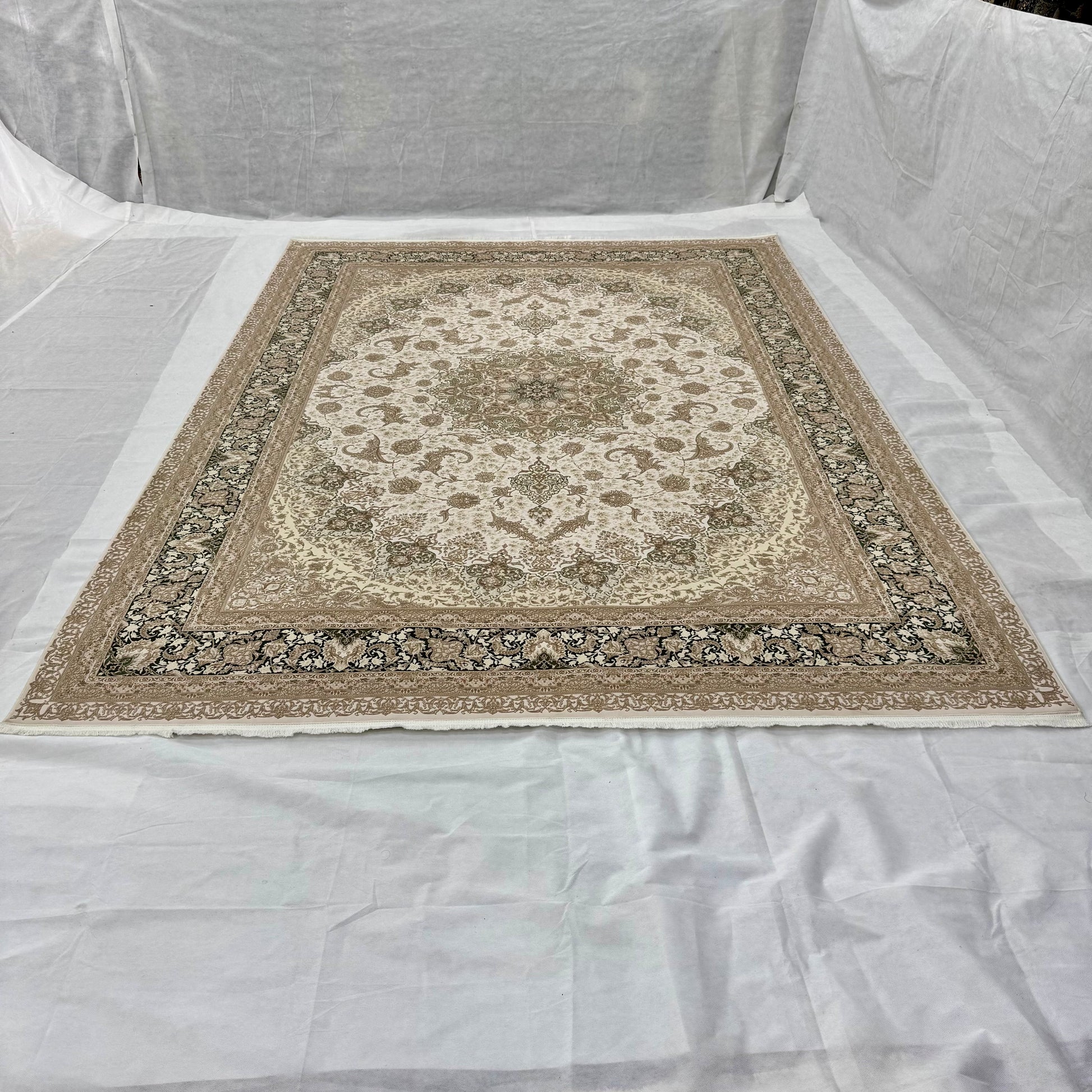 Bring timeless elegance to your interiors with the Beheshti Tabraiz Persian Rug. This 8x11 ft olive beige silk rug, crafted with machine-made excellence, showcases an intricate Persian medallion design with a richly detailed floral border. Soft, durable, and eco-friendly, it combines luxury with practicality, making it ideal for living rooms, bedrooms, and formal settings.