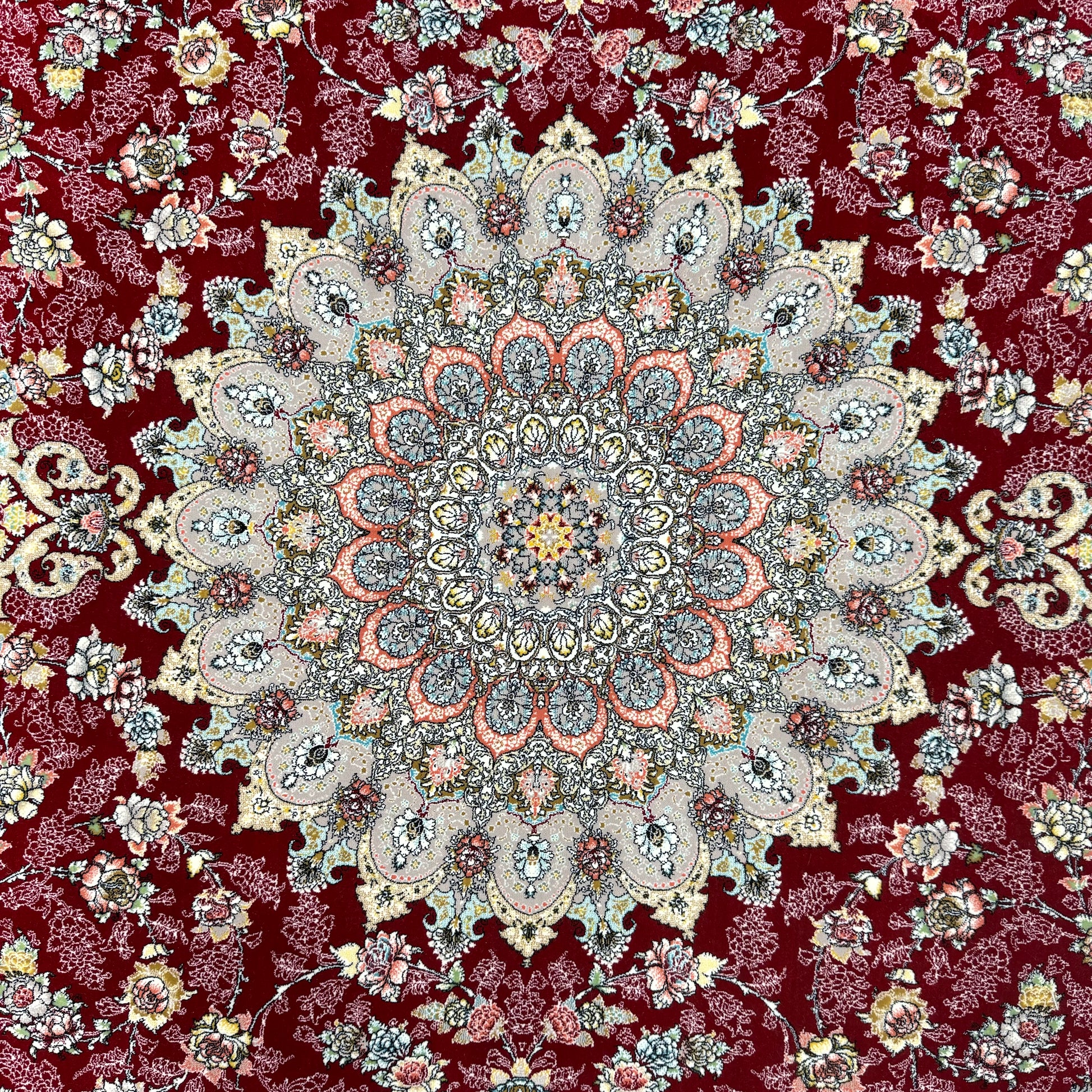 - Design & Style: The striking burgundy base is adorned with an intricate central medallion in shades of grey, surrounded by detailed floral patterns that create an opulent and timeless look.