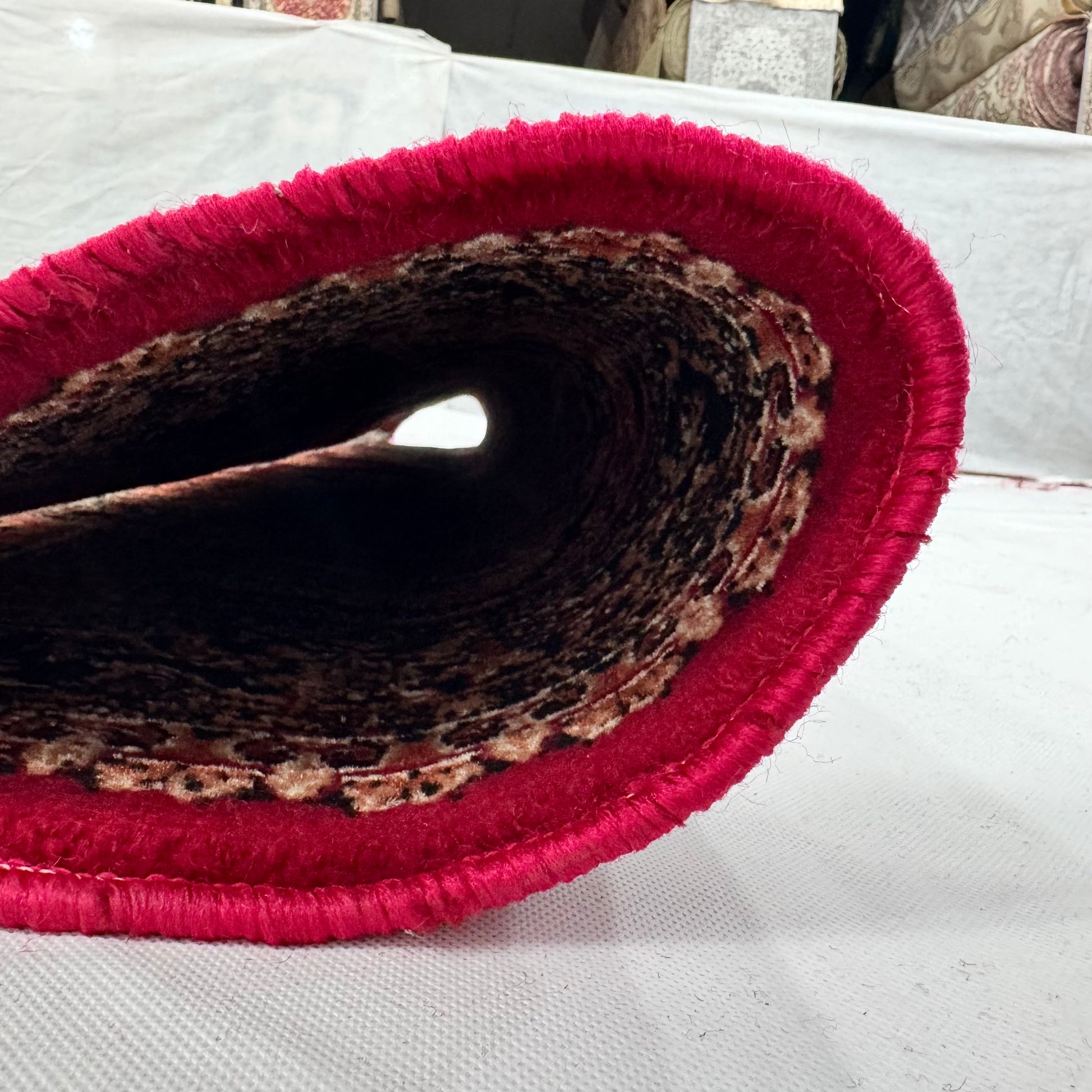 · Color: Deep Red with ivory, beige, and dark brown accents