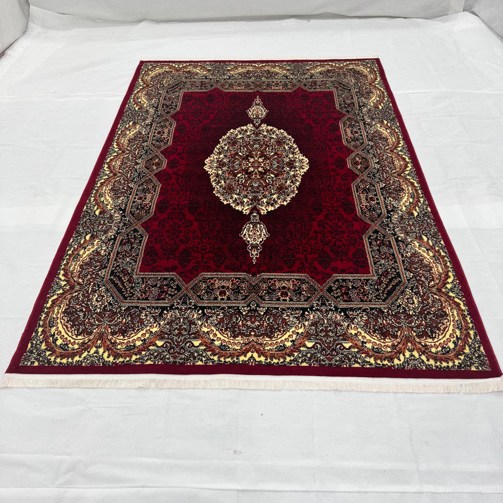 Traditional Persian Kashani rug featuring a deep red field with an elegant central medallion and richly detailed ornamental borders. Made in Iran with 500-reeds machine-made construction, this 7 ft x 10 ft rug delivers crisp pattern definition and uniform weave quality. Crafted from strong nylon fibers, it offers excellent durability, color retention, and low-maintenance care—ideal for both formal and high-use living spaces.