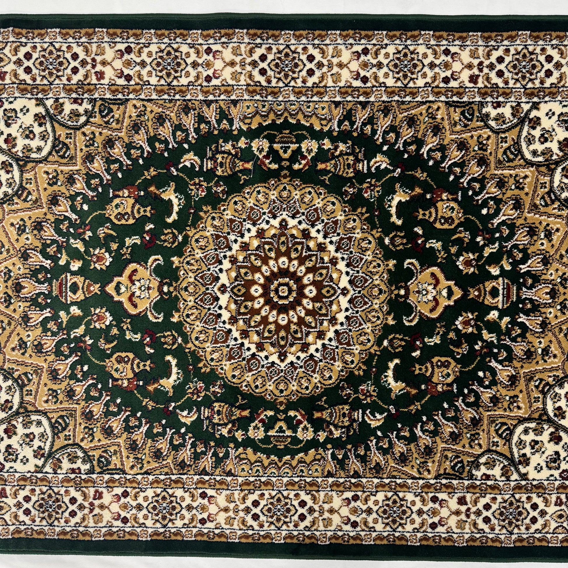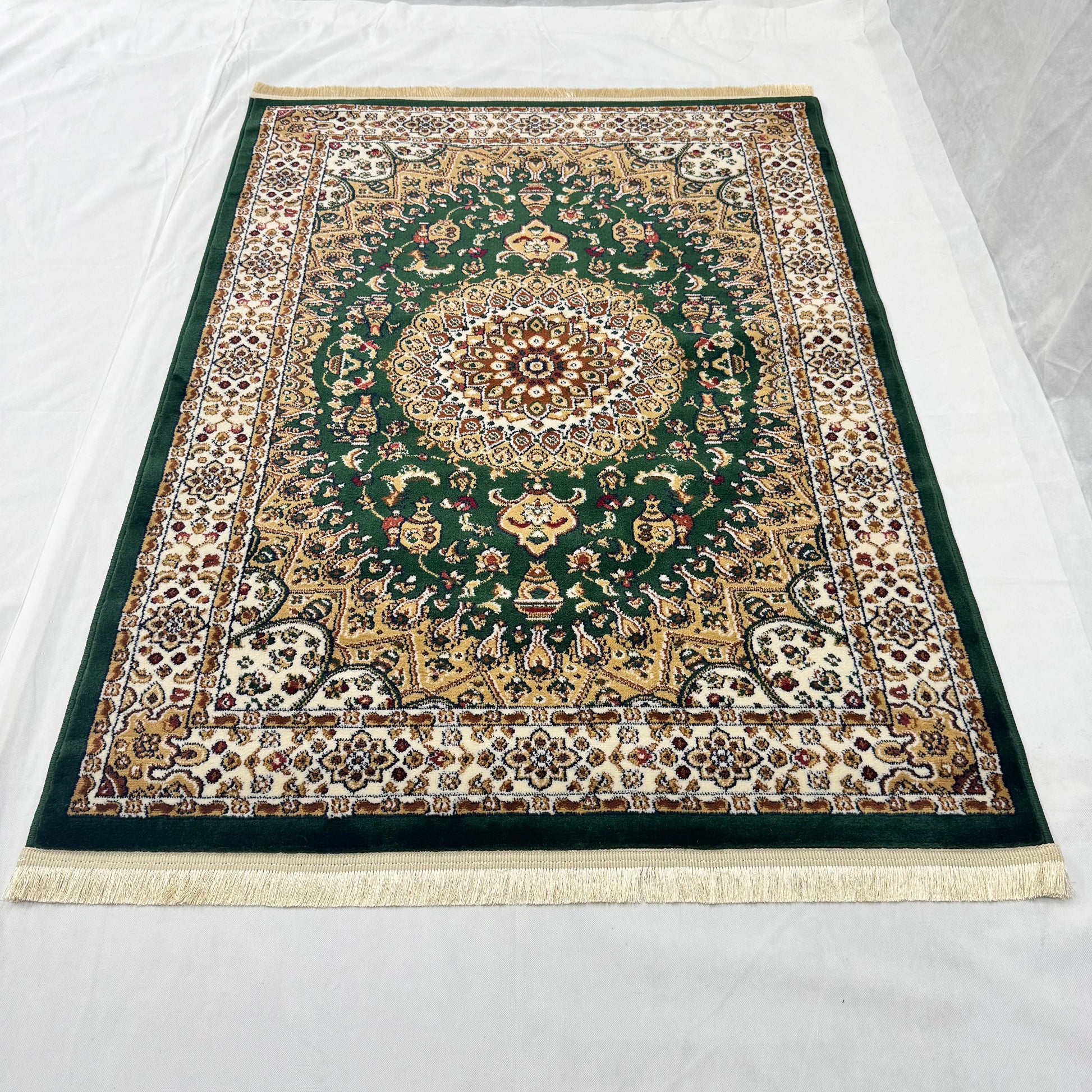 - Color: Rich green with golden medallion and ivory floral detailing